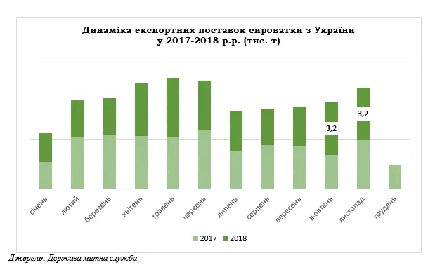 Сироватка була одним з основних молочних продуктів, попит на який стабільно зростав. Тому, експортні показники «не стояли на місці». Постачання на зовнішні ринки за період січень-листопад 2018 року склали 29,7 тис. т, на загальну вартість 31,4 млн USD. Позитивна динаміка вітчизняного виробництва (+112,7% проти 64,4 тис.т виробництва 2017 року) сприяла збільшенню експорту. Постачання українського продукту відбувалось до ринків Азійського регіону: Китаю, Філіппін, Південна Кореї, В’єтнаму.