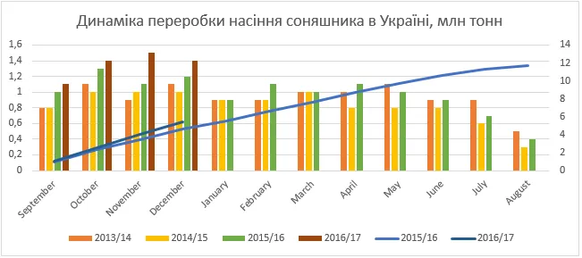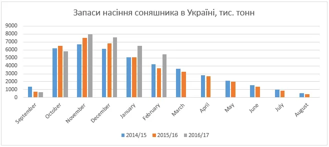 За словами аналітика, зростанню запасів сприяв рекордний урожай соняшнику минулого року – 14 млн тон, який став можливим завдяки збільшенню посівних площ під урожай соняшника сезону 2016/17 на 17%, сприятливим погодним умовам і достатній вологозабезпеченості ґрунту під час сівби олійної.