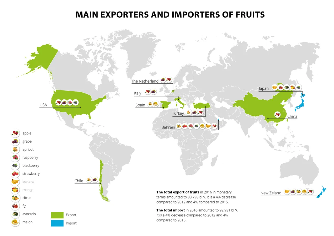 Загальний експорт фруктів в 2016 році в грошовому вираженні склав 83.798 млрд. долл. США (на 4% менше в порівнянні з 2012 роком і 4% з 2015 роком)", - сказав Богдан Шаповал.
