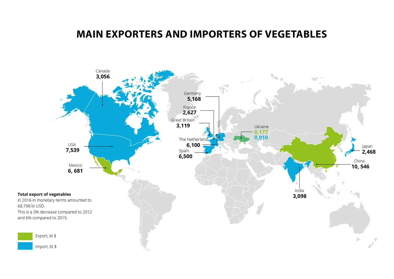 "В порівнянні з попередніми роками, загальний обсяг експорту овочів в 2016 році в грошовому вираженні склав 68.798 млрд. долл. США (на 3% менше в порівнянні з 2012 роком і на 6% з 2015 роком).
