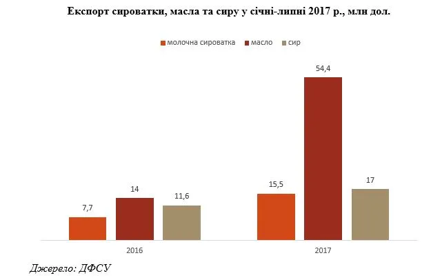 Українські виробники молочної продукції у січні-липні 2017 року заробили на експорті на 69,3% більше, ніж за аналогічний період минулого року. Як повідомив аналітичний департамент Ради з питань експорту продовольства (UFEB) з посиланням на дані Державної фіскальної служби, обсяг валютних надходжень від продажу молочних продуктів склав 140,8 млн дол.