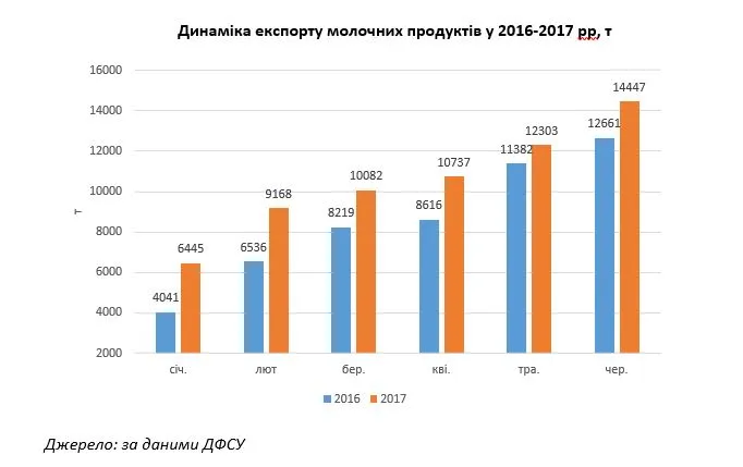 Експорт молочних продуктів з України в січні-червні 2017 року склав 63,2 тис. тон, що на 22,8% більше, ніж в аналогічному періоді минулого року, повідомив аналітичний департамент Ради з питань експорту продовольства (UFEB).
