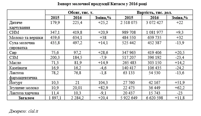 Як повідомляє АВМ, саме Китай став одним з основних рушіїв відновлення світового молочного ринку у 2016 році. Так, обсяг імпорту молочних продуктів до КНР за рік зріс на 20% в порівнянні з 2015 роком. Тоді як у 2015 році спостерігалось падіння на 12%.