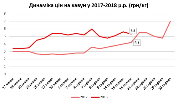 Розглядаючи динаміку ціни у поточному році можна відзначити її незначне зростання у сегменті кавунів порівнянні з аналогічним періодом минулого року ( на 1,1 грн/кг). Ціна ж на диню знизилась на 4,5 грн/кг.
