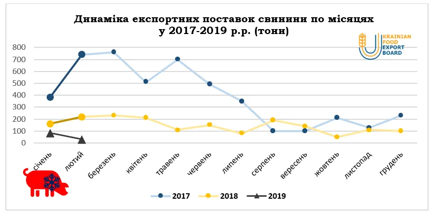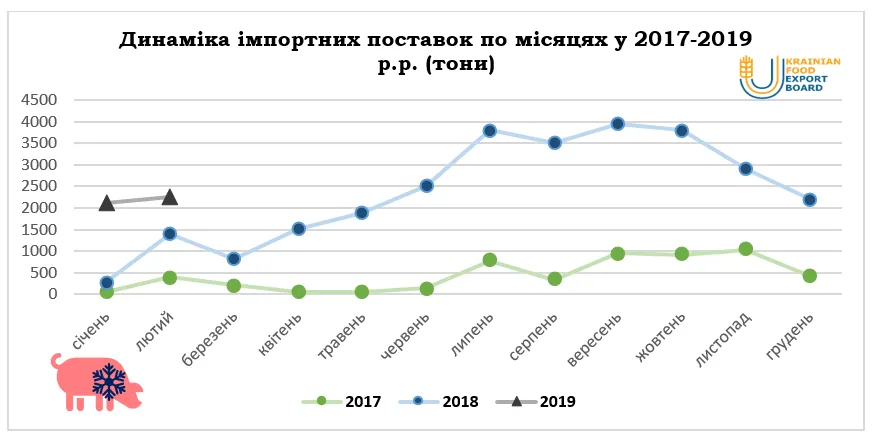 В той час, загальний обсяг імпорту свинини свіжої або охолодженої, мороженої за січень-лютий становив 4,4 тис. т. Відвантаження на внутрішній ринок у лютому становили 2,3 тис. т на загальну вартість 4,1 млн USD. Основними країнами постачальниками були: Польща – 1,6 тис. т (свинина лопатка, грудинка, половина туші, шия б/к, окіст), Німеччина – 280 тон (тримінг морожений 75/25 та 70/30, заморожена грудинка свиней, лопатка свиняча).
