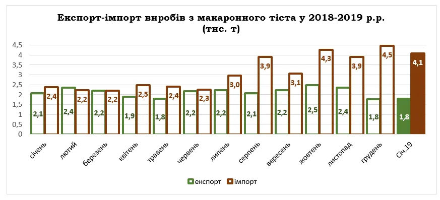 На вітчизняному ринку присутній великий асортимент імпортної продукції – це макаронні вироби середнього та преміум класу, якість і вартість яких значно вища за українські макарони. Підвищення попиту стимулювало зріст обсягу поставок з закордону на 31% (36,5 тис. т) проти показника 2017 року. Основними постачальниками макаронних виробів до України залишається Італія з часткою 39%, Туреччина – 31% та Польща – 19,7%.