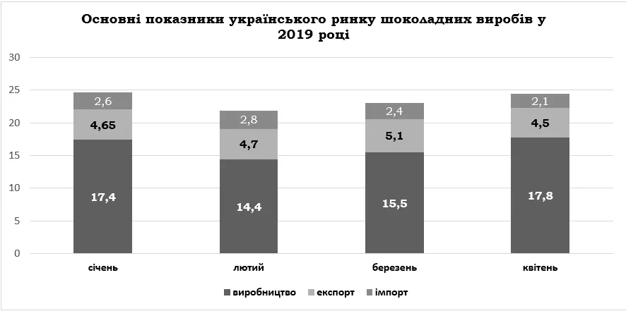 Згідно з даними Державної служби статистики, сегмент шоколадних виробів зростає у квітні 2019 року, але демонструє зменшення за підсумком перших чотирьох місяців за рахунок зниження виробництва у основних сегментах: шоколадних цукерок та кондитерських виробів з цукру чи його замінників. За підсумком чотирьох місяців сегмент знизився на 2,8% проти січня-квітня 2018 року (65,1 тис. т проти 67 тис. т).