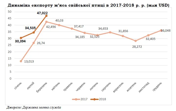 Експортовано м’яса свійської птиці та субпродуктів за перші три місяці 2018 року з України загальною вартістю 112 млн USD, що на 48% перевищує вартість експорту за аналогічний період 2017 року. Головними покупцями української курятини у січні-березні поточного року виступали Нідерланди – 27,5 млн USD (25% всього експорту), Словаччина – 14,120 млн USD (12,6%), Ірак – 13,4 млн USD (12%), частка інших країн складає 50,4% із загальною вартістю поставок 56,9 млн USD.