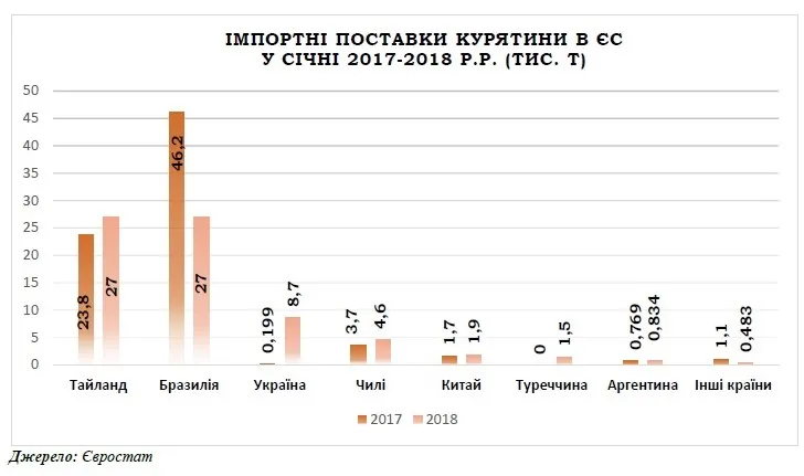 Згідно з даними Євростат, експортні поставки курятини з країн ЄС у січні поточного року зросли на 9% до 129,4 тис. т, тоді як імпортні у аналогічний період знизились на 9,7% до 69,9 тис. т.